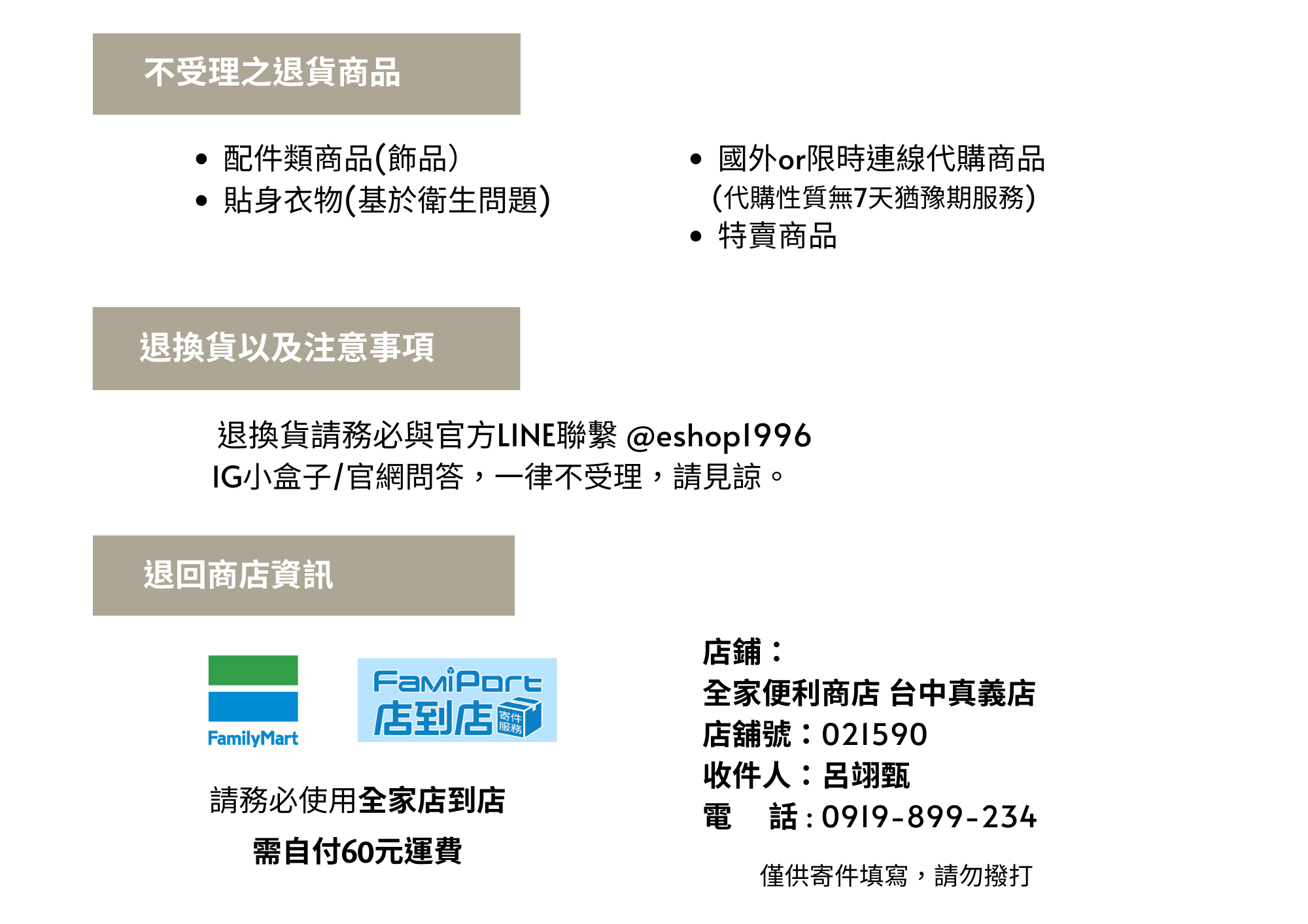 - 一年內如達 3次退換貨、一次性多件商品退貨、包色以及包尺寸挑選後退貨者,Eshop商品可能不符合您的期待,為避免日後爭議,將無法再為您提供退換貨服務,煩請斟酌自己的退貨次數。